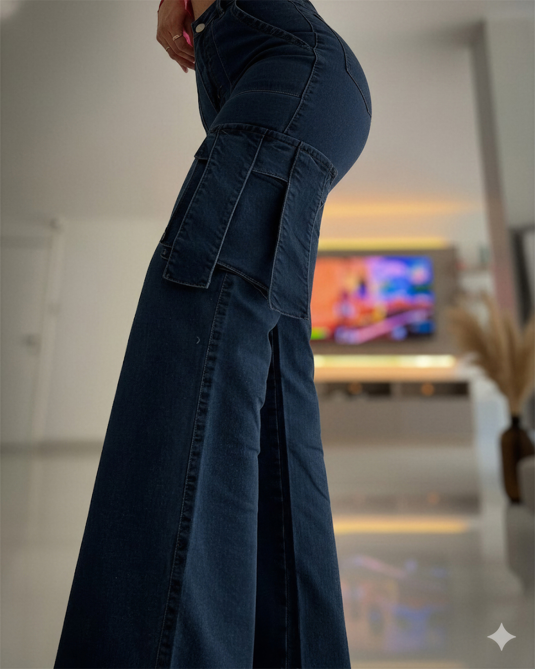 Presentamos el Pantalón Cargo Dual , confeccionado en denim de alta gama. Su diseño cuenta con 4 bolsillos, 2 en los laterales y 2 traseros, con accesorios y cremalleras metálicas, que realzan su lujo y funcionalidad.